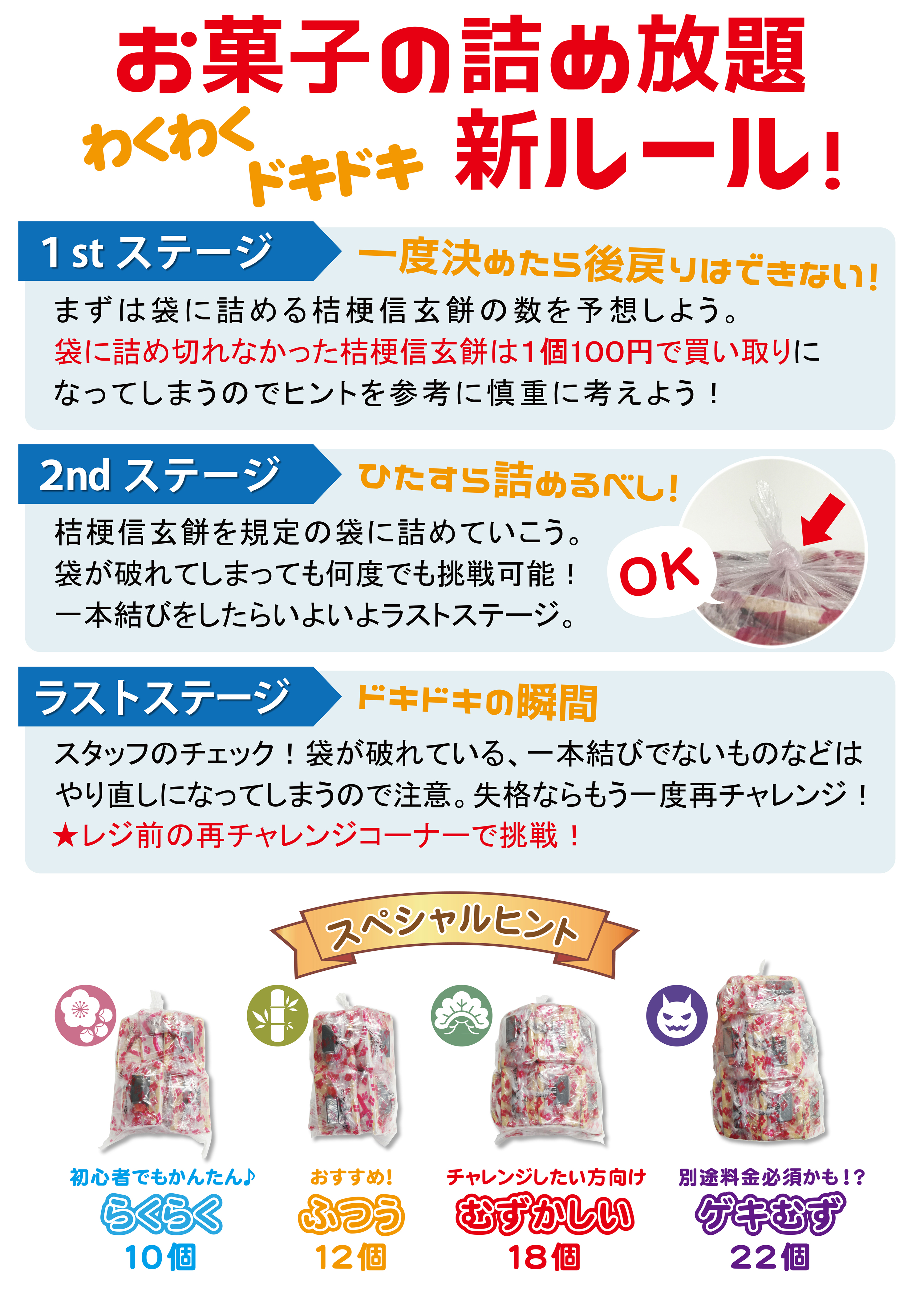 ※お菓子の詰め放題の桔梗信玄餅は当日消費です お早めにお召し上がりください