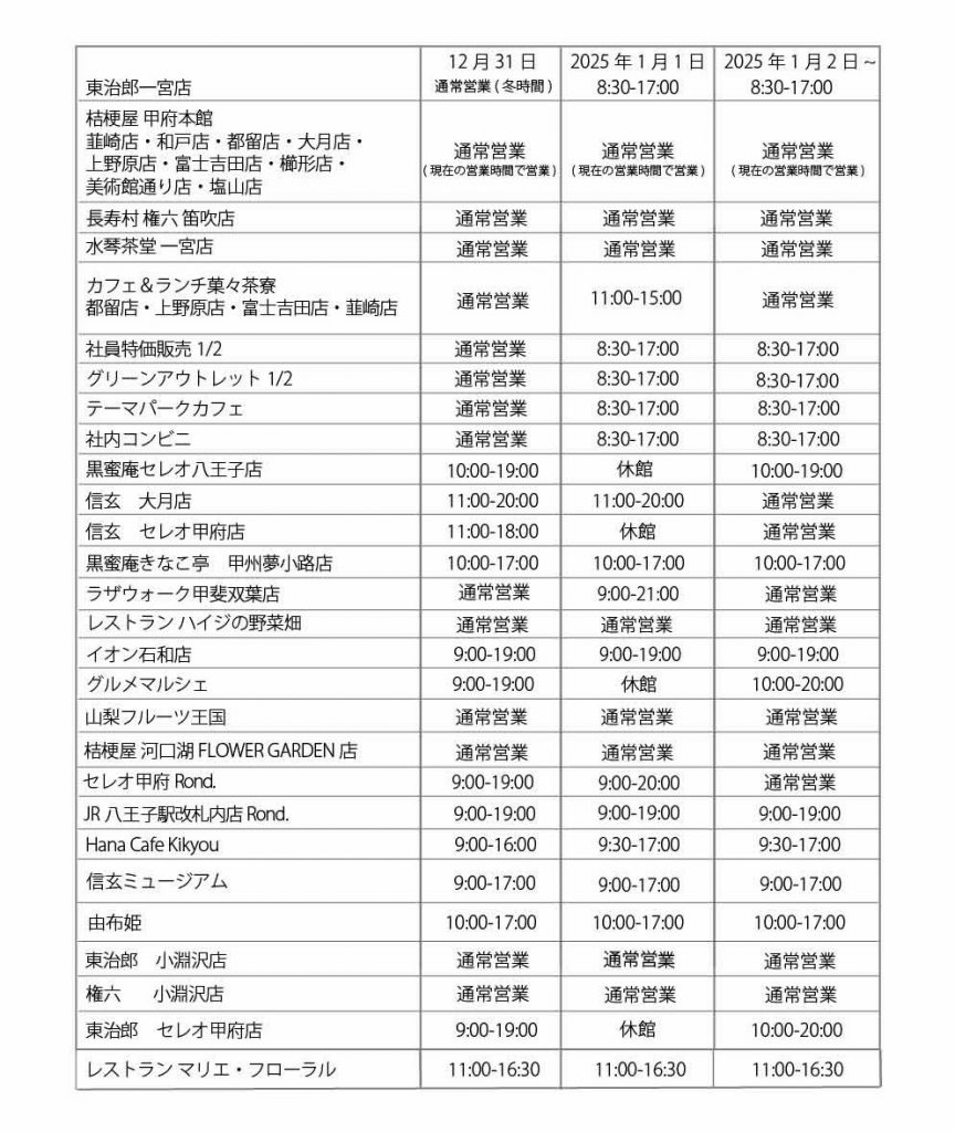 16 【お知らせ】新春初売り・迎春イベントのお知らせ 2018年1月1日・2日・3日午前10時~お菓子と食の桔梗信玄餅工場テーマパークにて「初詣縁日」を開催します。 新春を飾るおめでたい獅子舞、華やかな和楽器の音色で新春を祝う、琴・尺八の演奏会は東治郎一宮店ギャラリーホール […] 2017/12/16