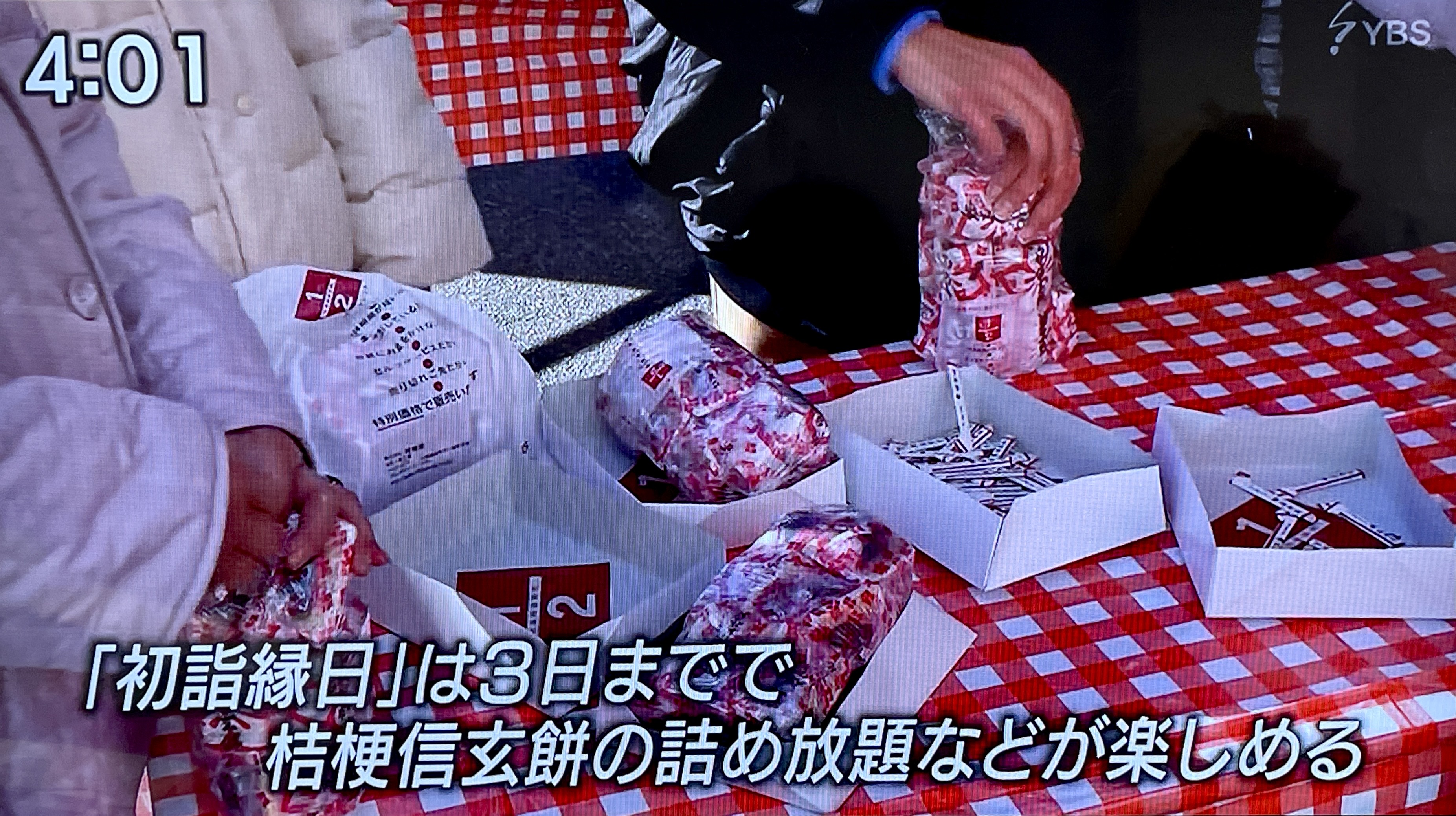 1月1日(水)YBS「NNN News every.」にて、桔梗信玄餅工場テーマパーク「初詣縁日」が紹介されました。 2025/01/02 1月1日(水)YBS「NNN News every.」にて、桔梗信玄餅工場テーマパーク「初詣縁日」が紹介されました。 関連記事 03 11月3日(日)読売新聞にクララ館にて行った調印式の様子が紹介されました スイスにある「バレンベルク野外博物館」と「ハイジの村」が姉妹提携を結び、11月1日にクララ館にておこなった調印式の様子が読売新聞にて紹介されました。 2019/11/03 13 【お知らせ】直営店舗の休業・休館日のお知らせ ■1/11~当面の間 休業 桔梗信玄餅工場テーマパーク内 テーマパークカフェ ■1/17(月) セレオ甲府休館日のため下記の店舗は休業致します ・東治郎セレオ甲府 ・グルメマルシェ ・郷土料理 信玄 &nb […] 2022/01/13 05 9月5日(火)山梨日日新聞で「ランチパック 桔梗信玄餅風」が掲載されました。 9月5日(火)山梨日日新聞で「ランチパック 桔梗信玄餅風」が紹介されました。 2017/09/05 この投稿へのコメント コメントはありません。 コメントを残す コメントをキャンセル メールアドレスが公開されることはありません。 * が付いている欄は必須項目ですコメント 名前 * メール * サイト 上に表示された文字を入力してください。 この投稿へのトラックバック トラックバックはありません。 トラックバック URL