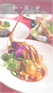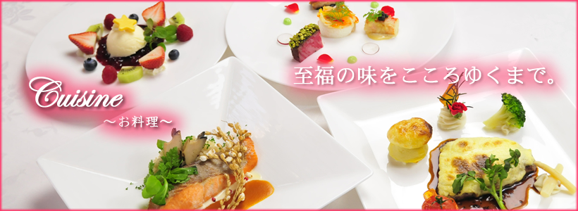 お二人とゲストの皆様すべての方に、笑顔あふれる幸せなひと時をお過ごしいただけるように、地元産の旬の食材にこだわり、趣向を凝らした料理をご提供させていただきます。アレルギーや苦手な食材がございましたら、お料理の内容を決める際にご相談ください。