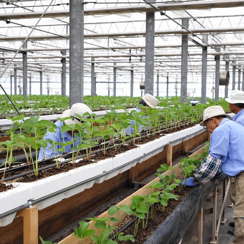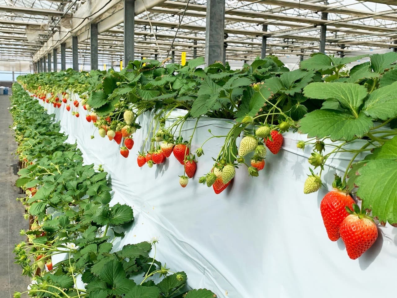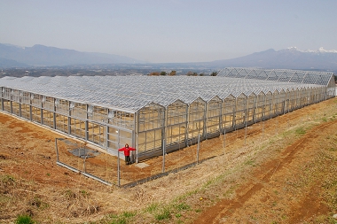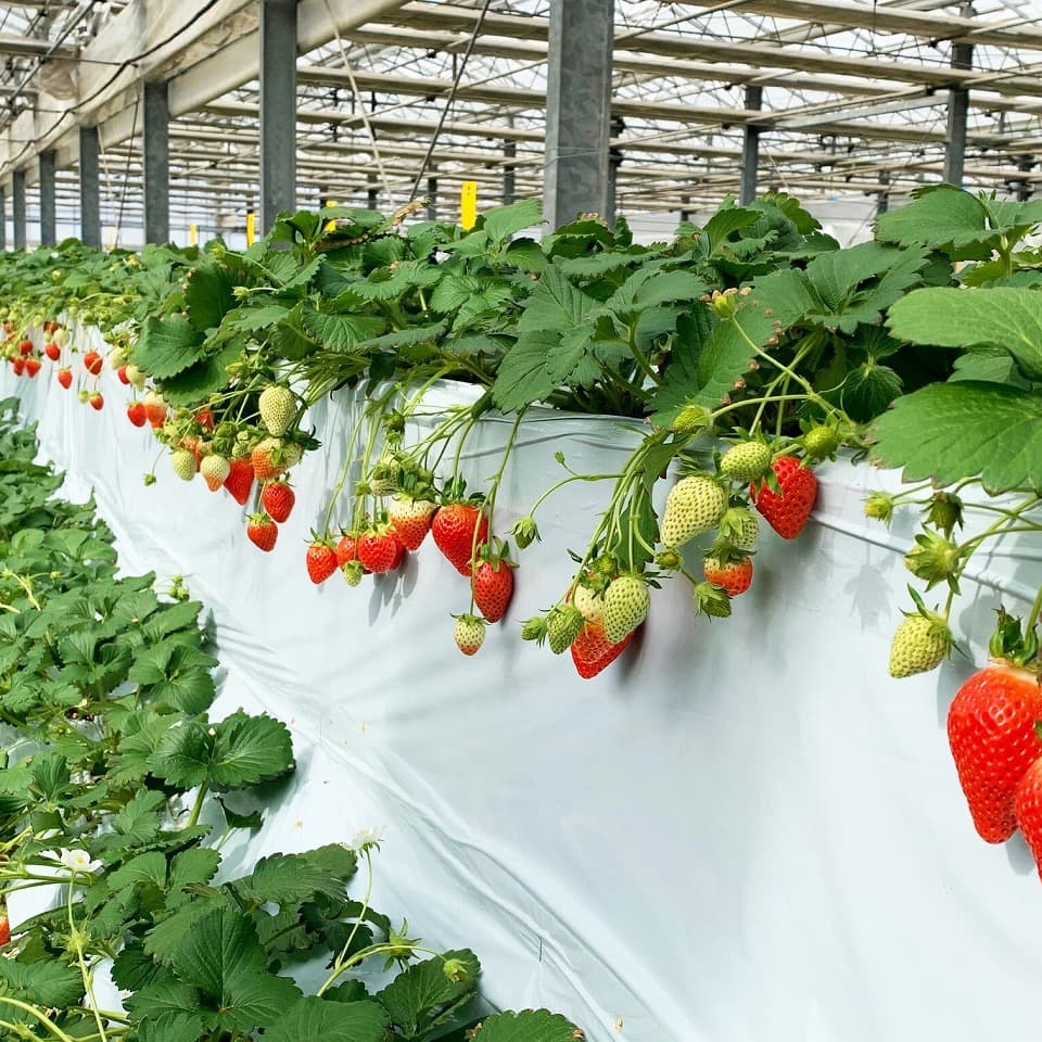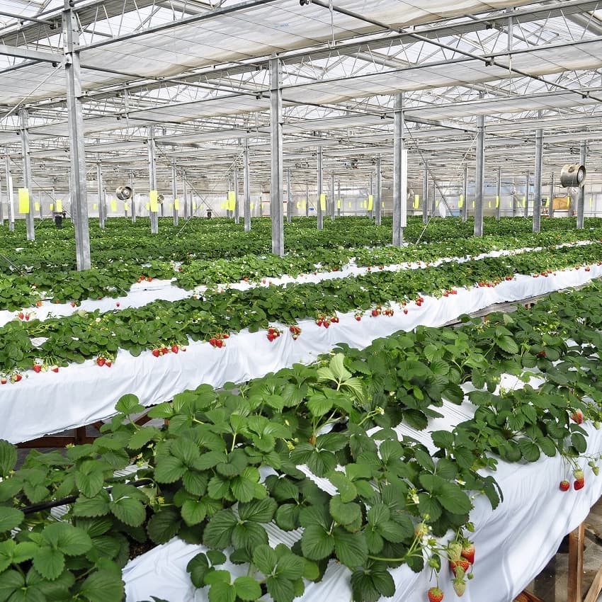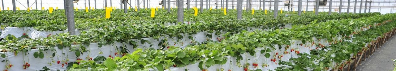 1,200坪のガラス温室の中が水耕栽培施設である明野プラントでは、 様々な品種の苺と珍しい姫小夏という桃の栽培をおこなっています。 明野プラントのある北杜市明野町は日照時間が日本一長いので、 あま~い苺が育つと言われています。