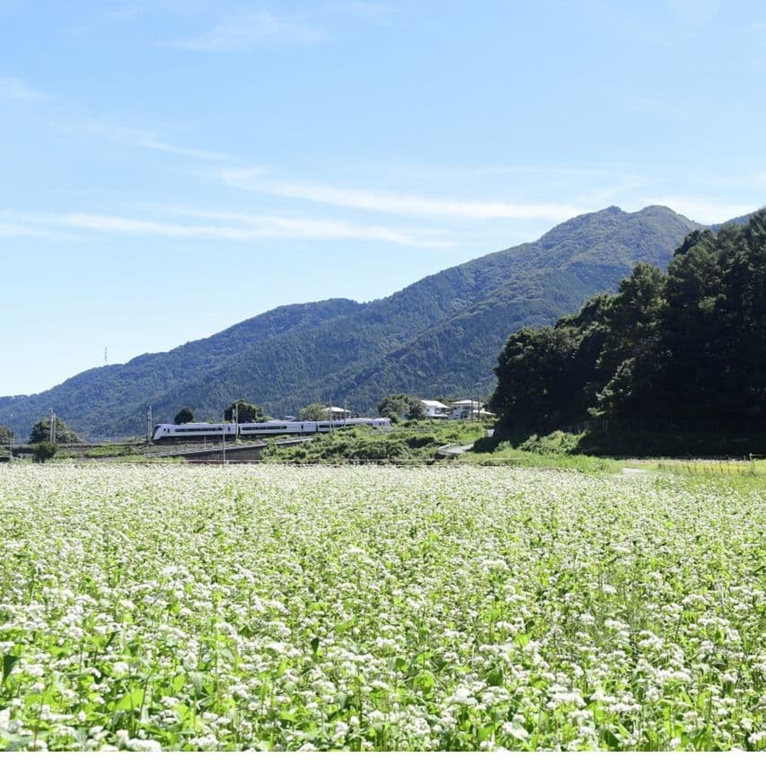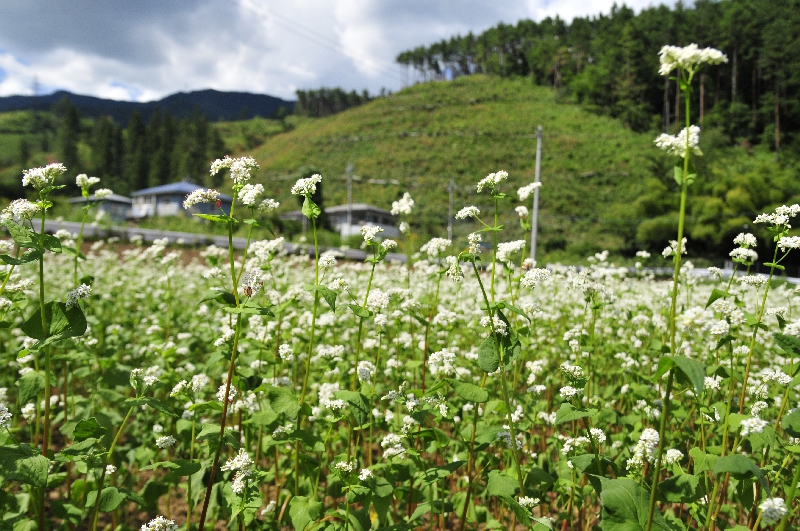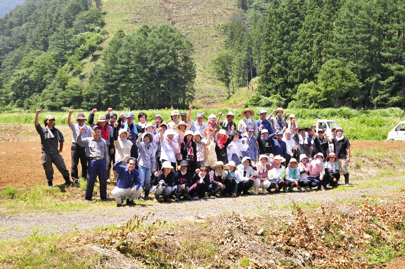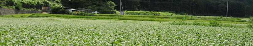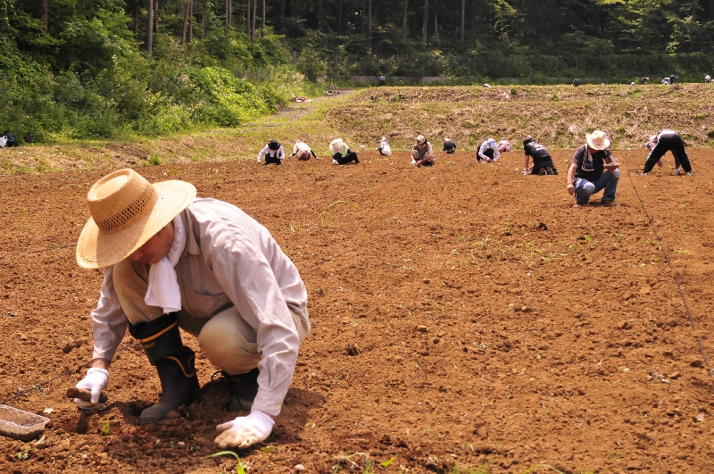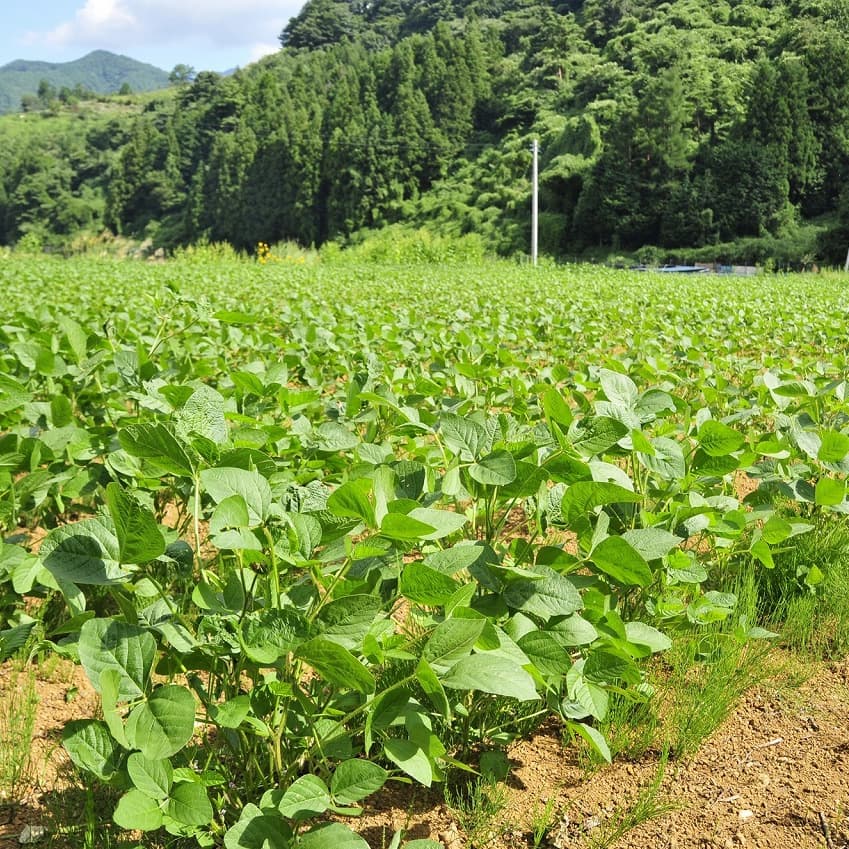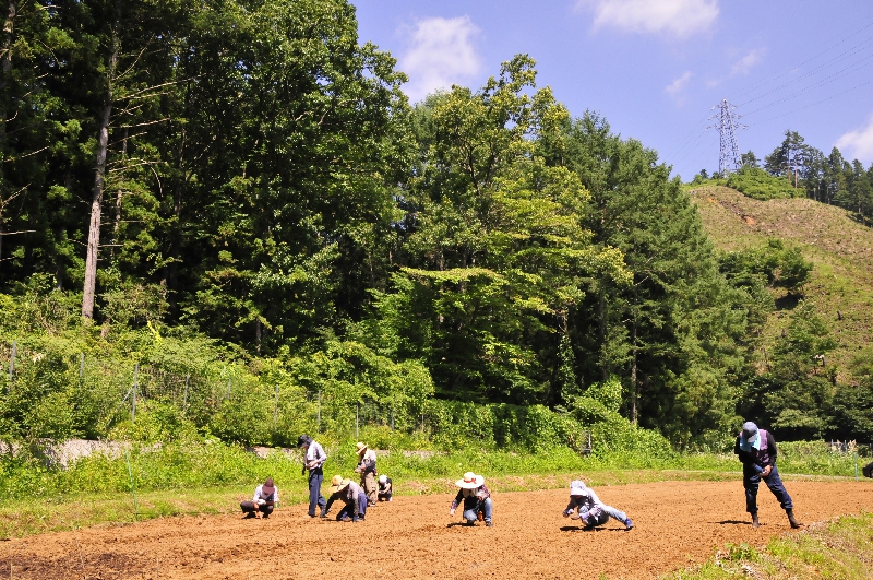 富士吉田上暮地<かみくれち>で2012年7月から始めた農場です。 ・山あいの平地、約5万平米に広がる休耕地を活用 ・桔梗屋グループの「そば」材料の自社生産 ・桔梗屋グループで販売する「青大豆」の栽培